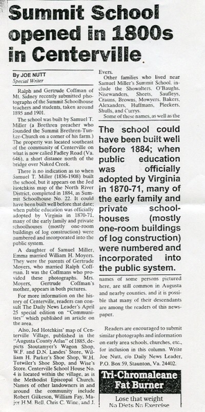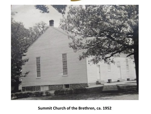Summit's story dates back in history to the years following 1770, when families of Brethren people came into the Shenandoah Valley of Virginia from Pennsylvania and Maryland, settling in Rockingham and Augusta Counties. These settlers developed the Middle River Congregation. We are told by 1850 the membership at Middle River had increased to more than five hundred members, scattered over a large territory. Out of the need for other places of worship, the Pleasant Valley Church was built in 1854 and the Barren Ridge Church was erected in 1856. During the early eighteen-seventies the western side of the Valley Congregation was divided into two other church communities, where the Summit (organized in 1874) and Lebanon church houses were built. Five or six Brethren families living in the community had already met in the first old Harmony school house near Seawright Springs, where preaching services were held. Interest increased and the church grew. Prior to the erection of the Summit Church house there was discussion around the Milnesville Community as to where to build. The people finally decided upon a location in a grove of trees on top of a hill, two miles east of Milnesville, which is now called Centerville.